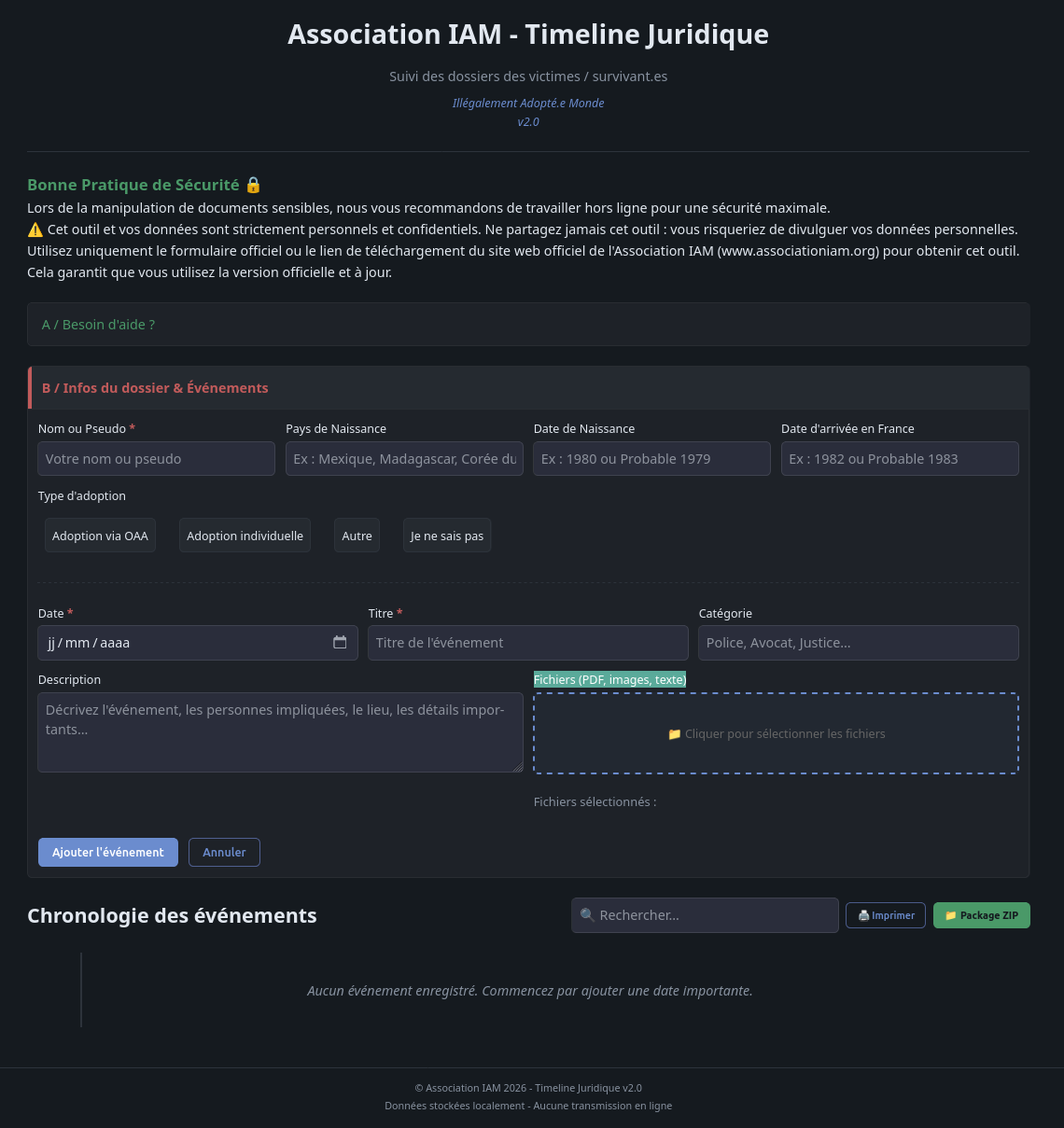- Package ZIP : Crée un fichier ZIP contenant votre chronologie au format HTML (lisible dans un navigateur) ainsi qu'un dossier avec tous vos documents de preuves joints aux événements. Vous pouvez transmettre ce fichier unique à votre avocat, un·e journaliste ou une association.